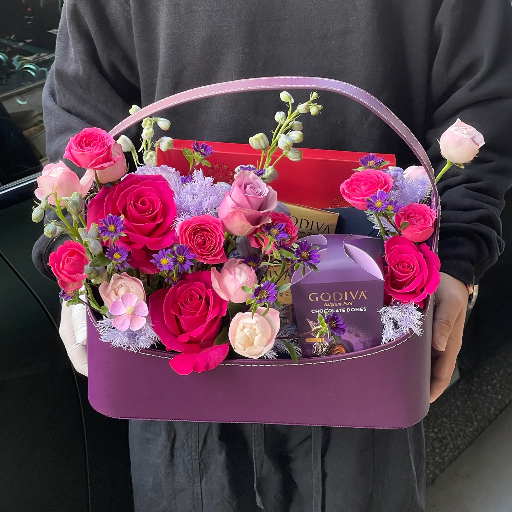 Premium Godiva Dark Chocolate Carrés and Pralines nestle among vibrant purple roses and delicate fresh flowers, creating a breathtaking display. Masterpieces Assortment and Domes Double Chocolate offer refined indulgence, while Signature Mini Bars in dark and milk chocolate provide elegant finishing touches. This floral celebration transforms premium pralines and mini bars into an unforgettable gift of beauty and taste.