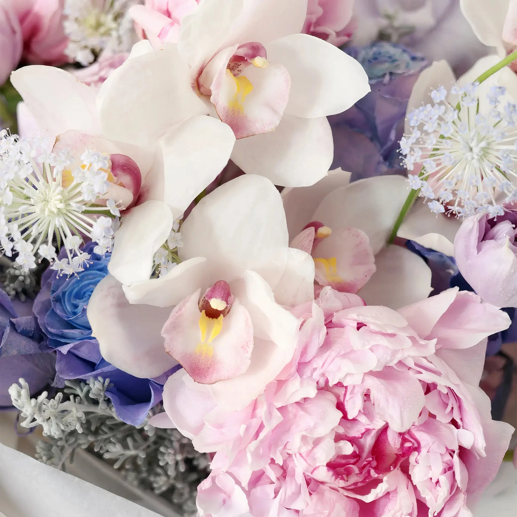 Surprise someone special with the ethereal beauty of our Celestial Dreams Luxury Bouquet – an enchanting blend of moonlit white roses, starlight orchids, and silvery-blue blooms that seem to capture the magic of a starry night.