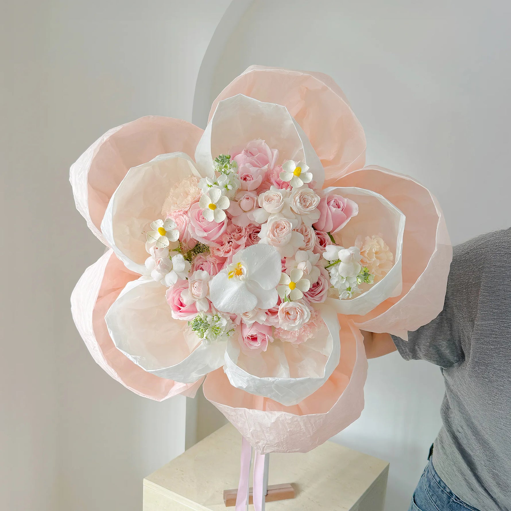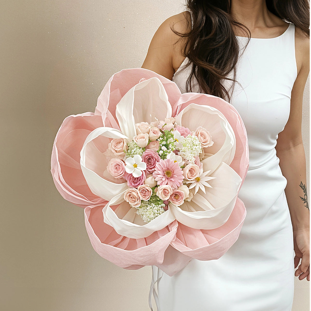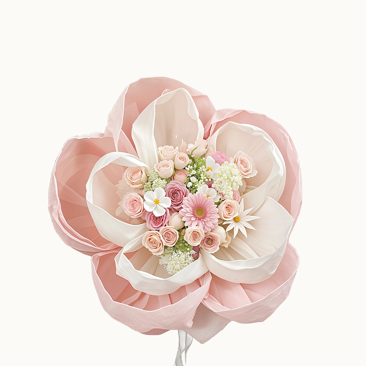 Express your deepest feelings with our Petals of Love Bouquet – an exquisite arrangement of soft pink roses, delicate white flowers, and baby's breath, beautifully nestled within layers of romantic pink and cream tulle petals. This artistic floral masterpiece transforms traditional bouquet presentation into a stunning work of art that captures hearts instantly.