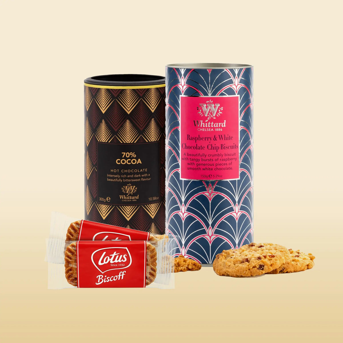Savour Whittard's Luxury Hot Chocolate, crafted from premium cocoa for a smooth, velvety richness. Enjoy the buttery sweetness of Raspberry White Chocolate Biscuits with a delicate hint of tart raspberry, and the golden caramel crunch of Lotus Biscoff Biscuits for the perfect cosy pairing. Each piece is thoughtfully chosen to bring comfort, warmth, and joy to every moment.