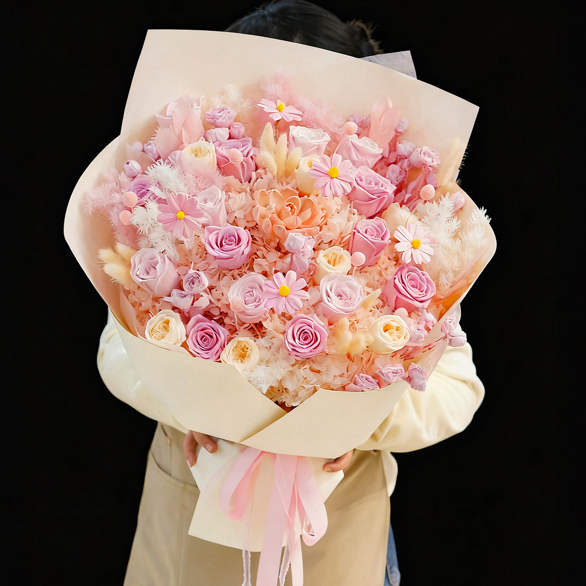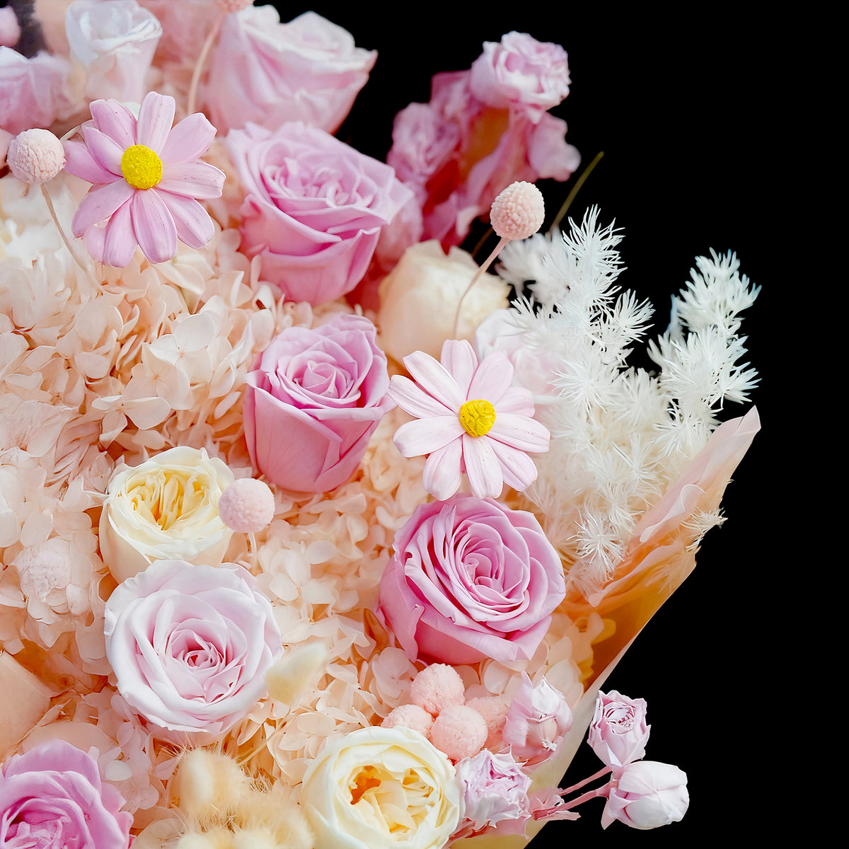 Express eternal love with this stunning pink everlasting bouquet of preserved flowers. Each delicate bloom in soft pink and blush tones maintains its natural beauty for years, making it the perfect floral gift for special occasions.