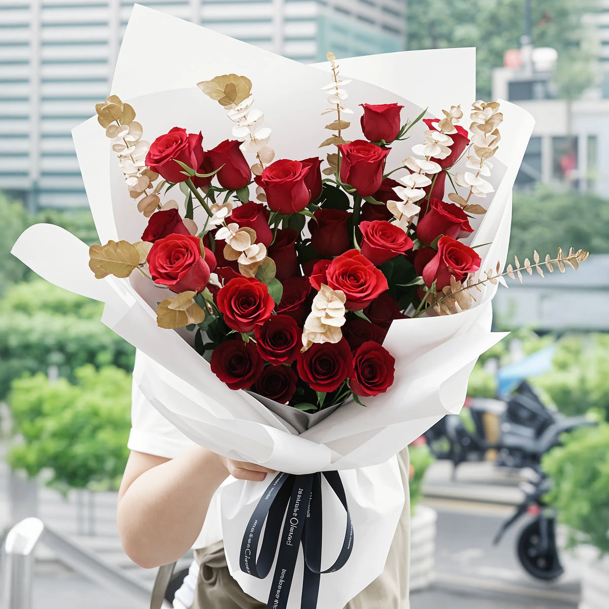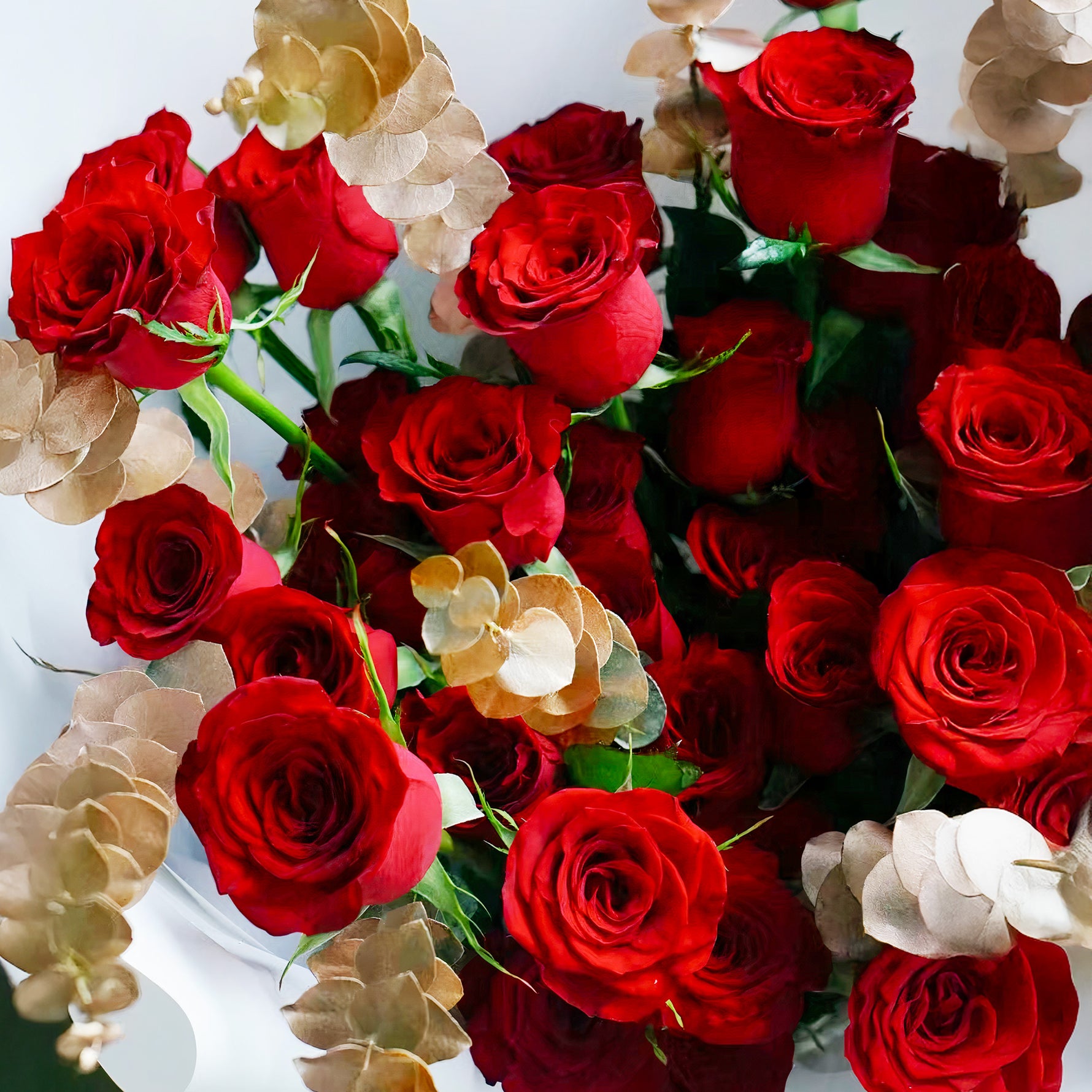 Express deep love with our Golden Red Rose Bouquet featuring vibrant red roses beautifully accented by shimmering golden eucalyptus. This stunning red roses bouquet combines passionate romance with elegant sophistication, creating the perfect romantic floral gift.