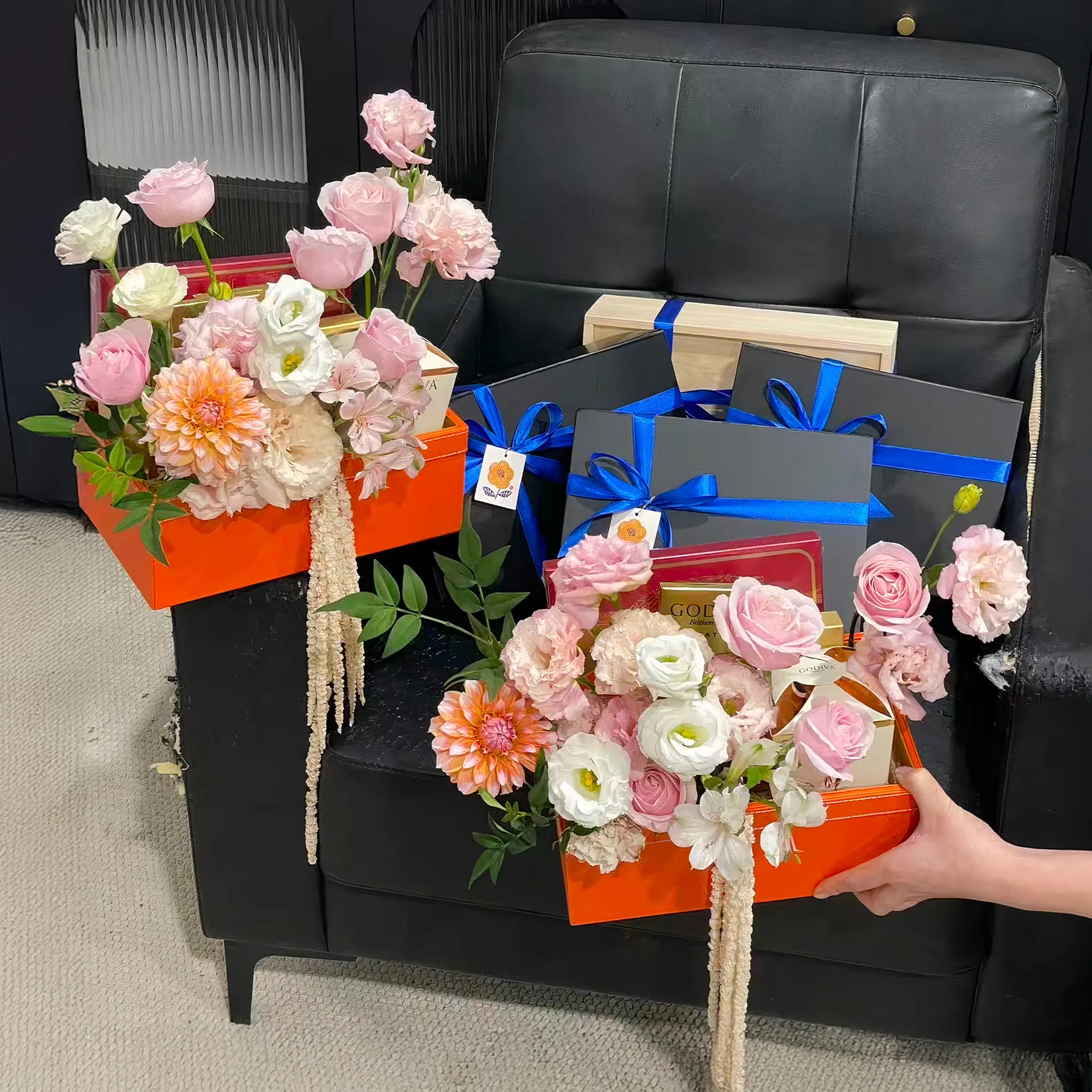 Godiva Signature Milk Chocolate Tablet delivers smooth richness, while Assorted Truffles and Pralines showcase the artistry of Belgian chocolate craftsmanship. The Gold Collection Gift Box presents handcrafted masterpieces, complemented by elegant Chocolate Pearls. Beautifully presented in a sophisticated Black Gift Box, this hamper transforms premium Godiva chocolates into an unforgettable presentation.